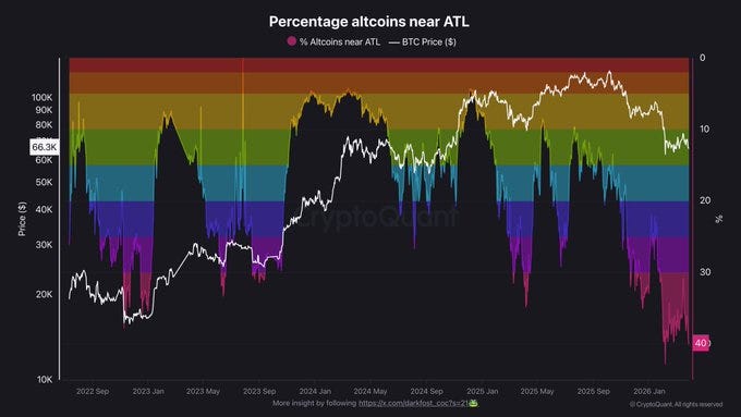 Un análisis más profundo revela la magnitud del problema. Más del 40 % de las altcoins han caído a sus niveles más bajos de la historia o están peligrosamente cerca. Esta cifra es incluso mayor que la registrada durante el mercado bajista anterior, que alcanzó alrededor del 38 %.