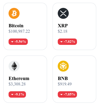 Bitcoin ha caído más del 6 %, hasta alrededor de 100 000 USD, llevando el índice de miedo y codicia a zona de miedo extremo. Otras grandes criptomonedas siguen la tendencia: Ethereum (– 5,7 %), Solana (– 8,2 %) y BNB (– 7 %), reflejando un clima de tensión generalizada en el mercado.