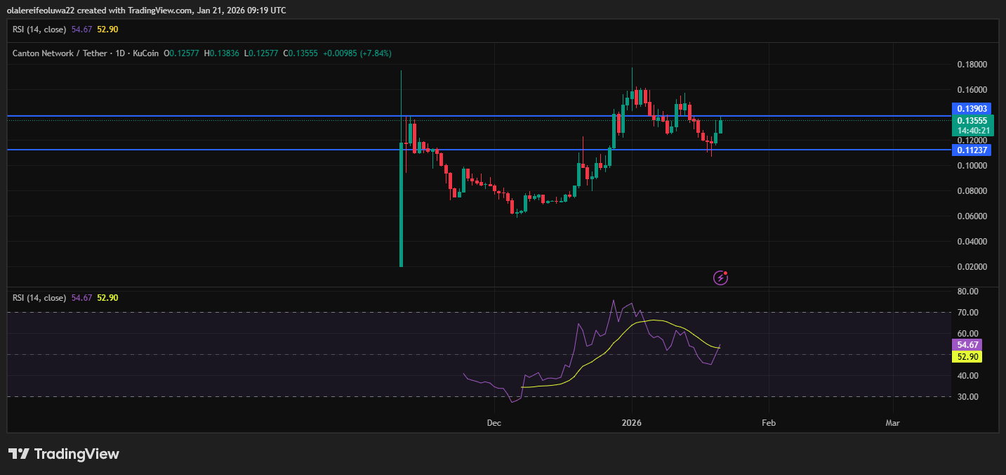 Canton Coin (CC), el activo nativo de la red Canton Network, es el token en el centro de atención hoy. El activo ha registrado un aumento del 11 % en las últimas 24 horas, marcando un cambio en el impulso a corto plazo. Aunque CC había acumulado varias sesiones diarias consecutivas en rojo, la acción del precio ha mejorado esta semana, lo que indica un renovado interés del mercado.